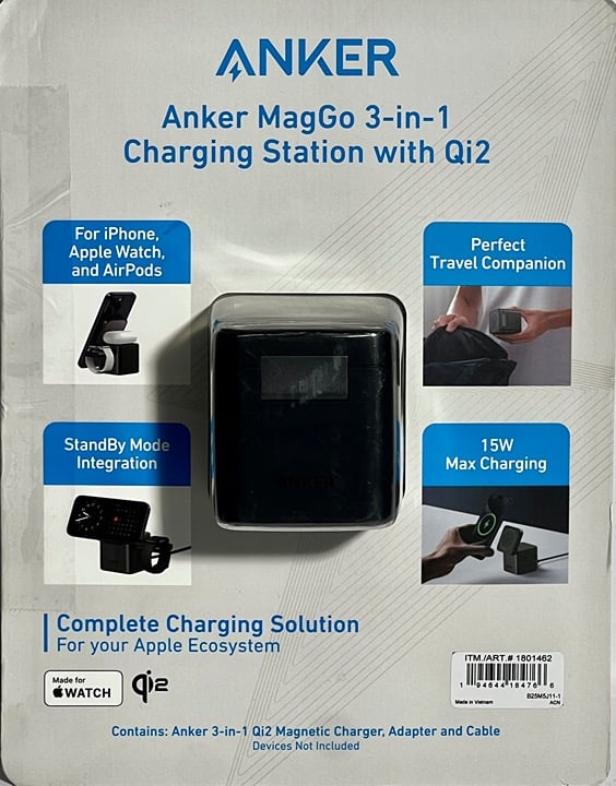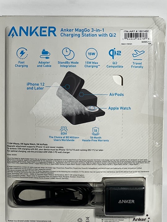 Experience the convenience of charging your iPhone 12 lineup with the Anker MagGo 3-in-1 Charging Station. Crafted to be compatible with MagSafe and Qi2 technology, this sleek black unit offers a seamless and efficient charging solution for your devices. Its compact design ensures it fits perfectly on your desk or nightstand, ready to power up your phone whenever you need it. Weighing in at just 1.26 pounds, this charging station is both portable and powerful. Anker's reputation for quality and durability is evident in this product, designed to support fast charging for your convenience. Keep your devices powered and poised with this modern addition to your tech essentials.